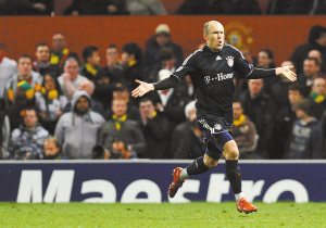 | ←8日,在欧冠四分之一决赛第二回合比赛中,拜仁客场以2:3不敌曼联,双方总比分战成4:4平,拜仁凭借客场进球数优势进入四强。图为拜仁球员罗本在比赛中庆祝进球。 新华社发 |