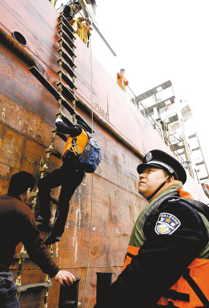 4月8日,边检民警登上一艘外国货轮进行检查。为实现世博期间上海港停泊长江口水域船舶安保无盲点,上海吴淞边检机关推出世博安保新举措,实行对在长江口水域中指定地点抛锚停泊的入境、入港船舶登轮检查,24小时驻船监护等一系列安保新措施。 新华社发