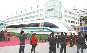 在成都交付的我国首辆高速磁浮国产化样车(4月8日摄)。 4月8日,我国首辆高速磁浮国产化样车在成都实现交付。该样车由中航工业成都飞机工业(集团)有限公司制造,标志着该企业已经具备了磁浮车辆国产化设计、整车集成和制造能力。 新华社发(张小洪 摄)
