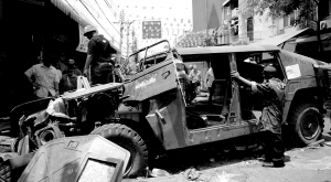 ←4月11日,在泰国首都曼谷民主纪念碑附近,“红衫军”成员查看损毁的军车。当天,随着“红衫军”与泰国军队的冲突暂时平息,曼谷局势趋于平静。 新华社发