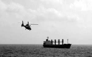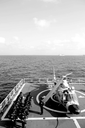 4月11日上午,海军第五批护航编队派出4组海军特战队员,从“广州”舰分别乘直升机和小艇前往“永欢”、“孔雀松”、“龙发”和“华强”4艘中国商船,开始执行为期3天的随船护卫任务。 新华社记者 刘春晖 摄