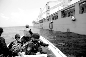 4月11日,在亚丁湾海域,中国海军第五批护航编队的特战队员乘小艇前往被护商船。