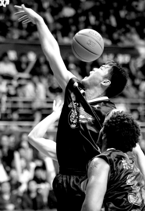 中国男子篮球职业联赛 广东进总决赛 4月11日,在中国男子篮球职业联赛半决赛第四回合比赛中,上海队主场75:103不敌广东队。广东队进入总决赛,他们将和新疆队争夺总冠军。图为广东队球员朱芳雨(上)上篮受阻。 新华社发