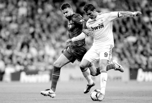4月10日,在西班牙足球甲级联赛第31轮比赛中,皇家马德里队主场以0:2不敌巴塞罗那队。图为皇家马德里队球员克里斯蒂亚诺·罗纳尔多(右)在比赛中与对方球员争抢。 新华社发