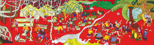 近观壁挂,宛如欣赏一幅海南黎族人民的“清明上河图”:五指山下,万泉河边,芒果熟了,木棉花开了,黎族人民晒着稻谷、织着布,跳着竹竿舞,享受着丰收的喜悦……热烈喜庆的画面再现了海南黎族人民生活工作场景,也表达了海南人民对上海世博会的诚挚祝福。
