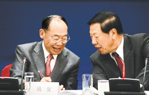 | 出席两岸企业家圆桌会议的台湾两岸共同市场基金会最高顾问钱复和全国社保基金理事会理事长戴相龙在交谈。 本报记者 李英挺 摄 |