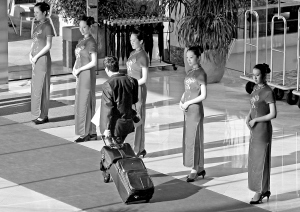 ← 4月11日,一名代表挥手告别博鳌。 → 4月11日,博鳌索菲特酒店大堂,礼仪小姐列队欢送离会代表。 本报记者 李英挺 摄