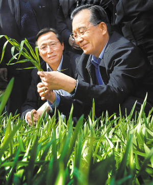 | 这是4月9日,温家宝在蚌埠市禹会区冯嘴村麦田察看麦苗分蘖情况。 新华社记者刘建生摄 |