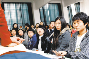 4月10日,华东师范大学的园区志愿者们在“紧急救护知识”培训课上,观摩老师的心肺复苏示范。 离上海世博会开幕还有20天,超200万人规模的世博会志愿者各项筹办准备工作已接近尾声。 包括园区志愿者、城市志愿服务站点志愿者在内的约20万世博会注册志愿者,自1月22日起在上海41个培训基地分类分批接受统一的培训并将经考核后上岗。新华社记者 刘颖 摄