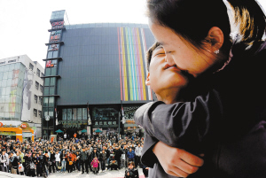 4月11日,一对情侣在比赛中。 当日,在沈阳商业街———中街举办了一场别开生面的接吻大赛。比赛要求在接吻的过程中,女孩双脚不得着地,以坚持时间长短来判定比赛胜负。新华社记者姚剑锋摄
