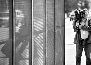 | 4月11日,在美国首都华盛顿会议中心用铁栅栏围成的警戒区外,一名摄像记者在拍摄。 新华社记者 张军 摄 |