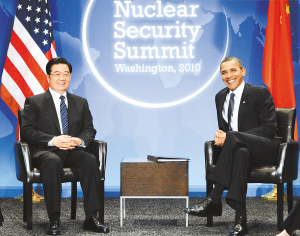 4月12日,出席核安全峰会的国家主席胡锦涛在华盛顿会见美国总统奥巴马。 新华社记者 李学仁 摄
