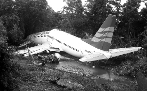 这是4月13日在印度尼西亚西巴布亚省马诺夸里市拍摄的发生坠河解体事故的飞机。当日,印尼鸽记航空公司一架波音737-300型客机在马诺夸里市林达尼机场降落时滑出跑道约700米,机头随后插入一条河里,机身解体成两部分。据当地媒体报道,当时客机上共有103名乘客,其中有20人受伤,已被送入医院接受治疗。 新华社/路透