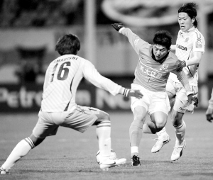 | →山东鲁能队球员崔鹏(中)带球突破。