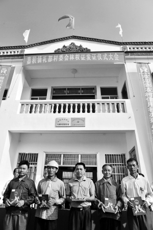 4月13日,天气晴好,临高县博厚镇抱珍村81岁的村民韦德清老汉一大早就打发小儿子上山打理自家橡胶林了。集体林权制度改革后,他家的26亩橡胶林取得了林权证。韦德清高兴地说:“以前村里常发生山林纠纷,邻里间很不愉快,都不敢放开手投钱造林。现在大家有了林权证,纠纷解决了,也敢放手搞生产了。”