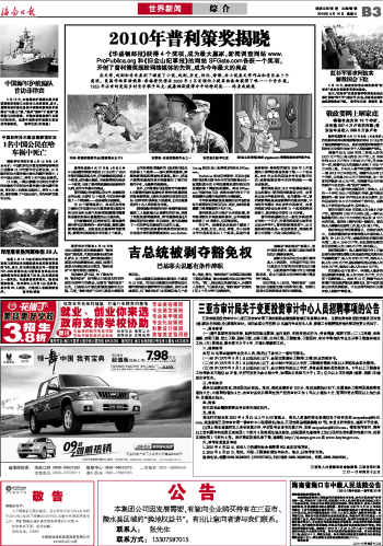 海南日报 世界新闻 综 合 011 2010-04-141 2010年04月14日 星期三