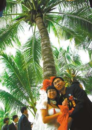 | 走进绿色旅游,感受生态文明。日前,三亚南山景区,一对新人亲密感受南国风光。 通讯员 陈文武 摄 |