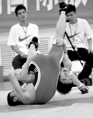 | 在海口进行的全国男子自由式摔跤锦标赛争夺激烈。 新华社发 |