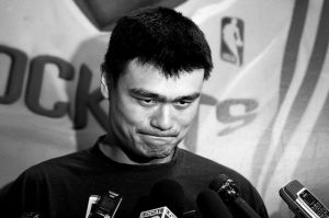4月14日,休斯敦火箭队球员姚明在赛前接受媒体采访时宣布,他的基金会将立即为青海地震灾区募集善款,并且根据震区情况实施下一步援助计划。图为姚明回答记者提问时表情凝重。 新华社发