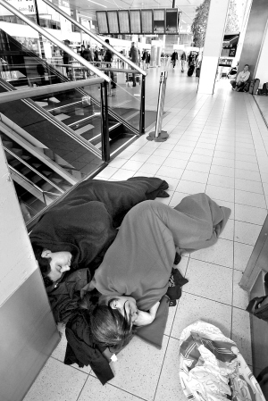 | 因航班取消两名旅客在荷兰一机场候机楼席地而睡。新华社发 |