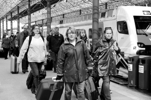 | 芬兰,火车站挤满了上下车的旅客。 新华社发 |