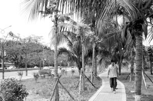 近日,三亚市凤凰路汇丰国际公寓路段,工人们正进行人行小道的铺设。据了解,今年以来,三亚市园林环卫部门着手对凤凰路美丽之冠至海螺农场路口段进行绿化带改造,种植了椰树等多种花草树木,增设了人行休闲小道,方便了春光小区居民的出行及休闲。图为改造完成的路段一景。 特约记者 孙清 摄
