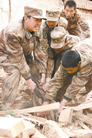 4月19日,玉树军分区司令员吴勇(左一)带领官兵清理地震废墟。 玉树地震后,玉树军分区司令员吴勇一直忘我工作,这期间,吴勇没顾上吃一口热饭、喝一口热水。一直和他并肩战斗的军分区政委王全进告诉记者,吴司令员第一天吃了半块馒头,第二天吃了一个白皮面饼,第三天吃了两块面包,直到第4天早上才喝了一碗热稀饭。吴勇说:“救不出乡亲,我吃不下饭啊!” 新华社发 玉树军分区司令员吴勇: 救不出乡亲我吃不下饭