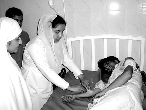 4月19日,在巴基斯坦西北部城市白沙瓦,一所警察子弟学校遭袭,一名在爆炸中受伤的男子在医院接受治疗。 巴基斯坦警方当日说,白沙瓦游行队伍当天也遭袭,造成60多人伤亡。 新华社发