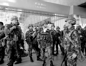 据来自泰国军方的消息,军方当天在是隆路主要银行、公园和轻轨车站部署了兵力。