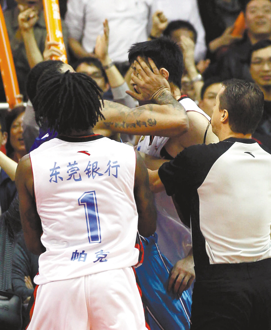 4月18日,广东队球员杜锋(右二)被击中脸部。 新华社发