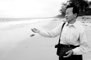 | 4月18日,原琼山市史志办主任王万江,在海口市桂林洋海边讲述当年解放军渡海作战的故事。 本报记者 苏晓杰 摄 |