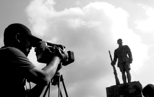 | →4月19日,海口市琼山区云龙镇琼崖红军改编旧址,一位媒体记者在拍摄英雄塑像。 本报记者 李英挺 摄 |