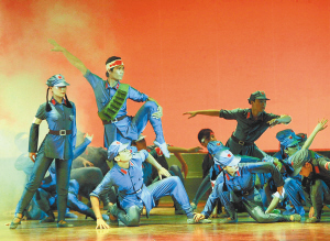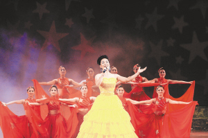 | ←↑ 4月19日晚,纪念海南解放60周年暨欢庆五一大型文艺晚会在海口人大会堂举行。图为晚会现场的歌舞表演。 本报记者 陈德雄 摄