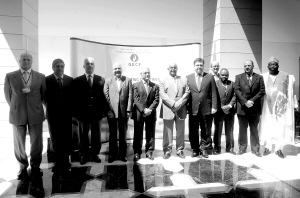 4月19日,在阿尔及利亚奥兰,俄罗斯能源部长谢尔盖·什马特科、卡塔尔副首相兼能源和工业大臣阿卜杜拉·本·哈马德·阿提亚、阿尔及利亚能源和矿业部长沙基卜·哈利勒(右五至右七)和其他几位参加天然气出口国论坛的官员合影。为应对国际天然气价格下跌,当日在这里举行的天然气出口国论坛第十届部长级会议希望天然气价格与石油价格挂钩,但没有出台削减天然气产量的计划。 新华社发