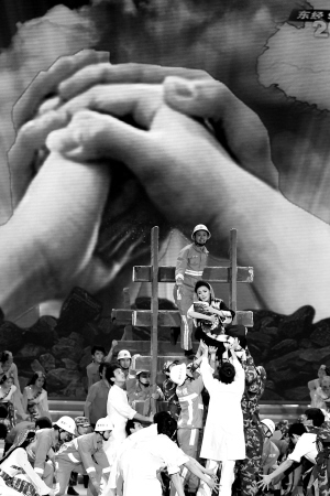 四月二十日,“情系玉树、大爱无疆”抗震救灾大型募捐活动特别节目在北京举行。这是募捐活动特别节目中表现抗震救灾的场景。 新华社记者 丁林 摄
