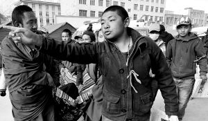 4月20日,在青海玉树州体育场内,佩戴着“红布条”的志愿者高二学生旦增在给一个急救病人指路。 本报特派记者 宋国强 摄