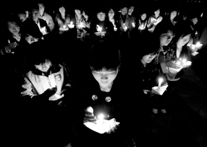 | 四月二十日晚,天津南开大学文学院师生在校园内手捧蜡烛,组成爱心图样,表达对青海玉树地震遇难同胞的深切哀悼。 新华社记者 刘海峰 摄 |