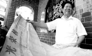 | 蒙国海向本报记者展示1974年自己被评为广东省先进工作者时的光荣榜。 本报记者 李英挺 摄 |