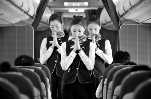 | 4月21日,海南航空公司HU7005次航班举行哀悼仪式,悼念青海玉树地震遇难同胞。这是乘务员在默哀。 新华社记者 郭程 摄 |