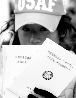 4月21日,一名志愿者在展示“救灾手册”。当日,卫生防疫部门开始向青海玉树受灾群众发放《地震灾害后食品、饮用水卫生、消毒杀虫、传染病防治知识》手册,广泛开展灾后卫生防疫安全宣传。 新华社记者李紫恒 摄