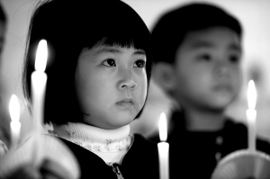 ←4月21日,桂林市前锋幼儿园的孩子们手捧蜡烛,为玉树地震灾区的小朋友祈福。 新华社 唐艳兰 摄