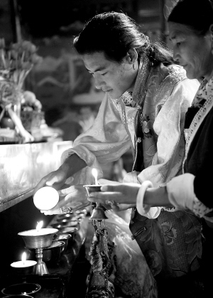 ↑4月21日,云南的藏族青年尼玛队主(左)和都吉卓玛点燃长明灯,深切悼念玉树地震遇难同胞。