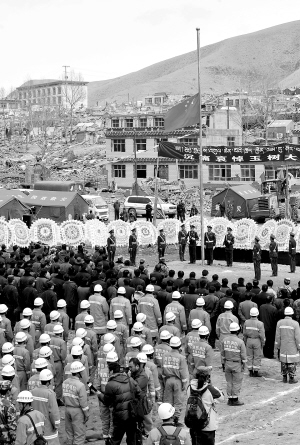 ←4月21日,山东英才学院万名师生哀悼青海玉树地震遇难同胞。