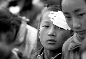 ↑4月21日,在玉树县结古镇政府广场举行的悼念仪式上,13岁的旦增江永眼神坚毅。就读于玉树县第三完小的丹增江永和11岁的弟弟索南江措自小失去父母,后被叔叔收养。但在“4·14地震”中,叔叔也不幸遇难,兄弟二人再次成为孤儿。 本报特派记者 宋国强 摄