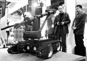 中国国际警用 装备博览会开幕 这是4月21日拍摄的排爆炸物机器人。 当日,“第五届中国国际警用装备博览会”在北京展览馆开幕,近300家厂商参展。本届博览会的主题为“实现和谐平安社会,共筑国际安全防线”。 新华社记者 唐师曾 摄