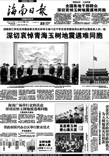 海南广场举行哀悼活动 深切哀悼玉树地震遇难同胞