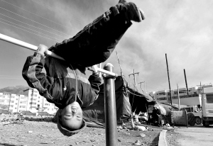 ↓ 4月20日,在玉树州体育场安置区内,儿童在安置区内的体育健身器材前游玩。