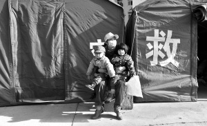 ↑2010年4月20日,在玉树州体育场安置区内,一位妇女抱着两个亲戚的孩子在帐篷前享受阳光。