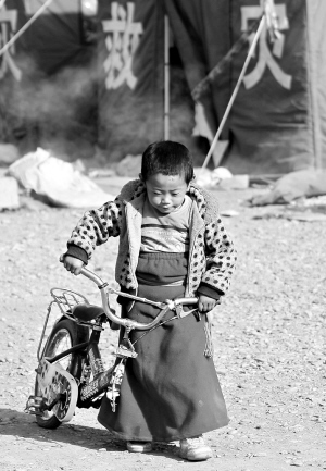 ← 4月20日,在玉树州体育场安置区内,儿童推着一辆没有前轮车子在玩耍。