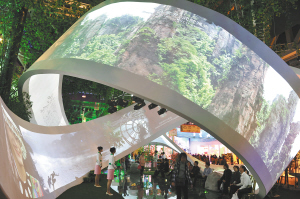 上海世博会的中国省区市联合馆里,除了海南馆外还有30个兄弟省市在这里各显精彩。 湖南馆:在造型奇特的曲面环上投映着湖南回顾历史与畅想未来的画面,寓意人类对未来的期盼和追求永不停歇。 本报特派记者王凯 摄